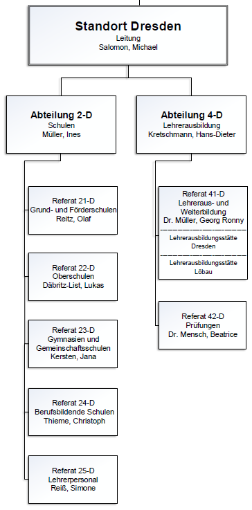 Regional ist der Standort für die schulfachlichen Angelegenheiten und die Personalangelegenheiten der Schulen in dem Landkreis Sächsische Schweiz - Osterzgebirge, dem Landkreis Meißen und in der Stadt Dresden zuständig.